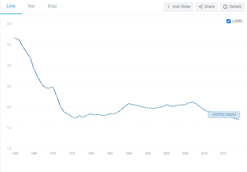 世界銀行公佈的數據顯示,2007年美國的TFR還在2.1以上,到2019年,已經跌到1.7左右。