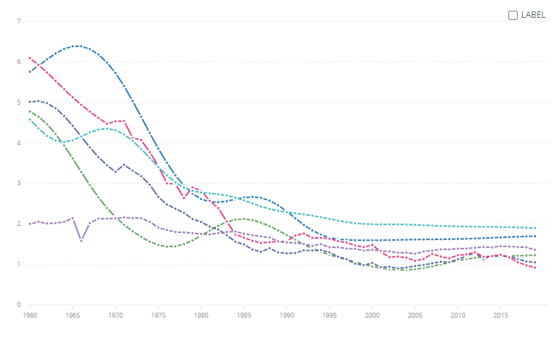 圖為世界銀行公佈的東北亞部分地區生育率趨勢,圖中包含日本、中國內地、中國香港、中國澳門、韓國和朝鮮,圖中抵達終點時位置最高的線代表北邊兄弟的TFR,圖中數據截至時間為2019年