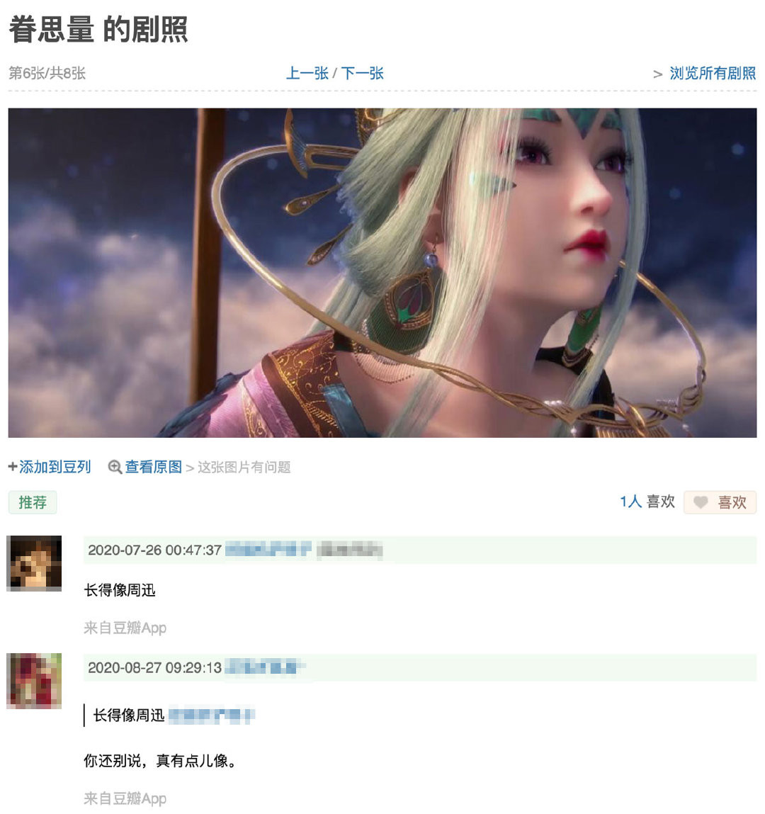 在目前網絡上有關《眷思量》的討論中,我們時常都能看到“某位登場角色看起來像某位明星”的論調。比如在豆瓣,該動畫此前公開的女角色“奉眠”,就有人認為她長得特別像周迅。
