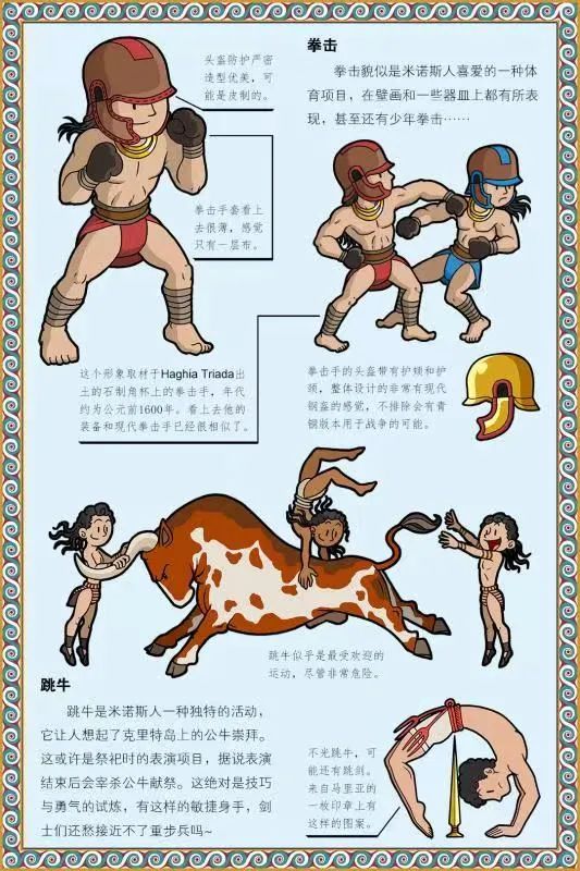 拳擊貌似是米諾斯人喜愛的一種體育項目,在壁畫和一些器皿上都有所表現,甚至還有少年拳擊……拳擊手的頭盔帶有護頰和護頸,整體設計的非常有現代鋼盔的感覺,不排除會有青銅版本用於戰爭的可能。