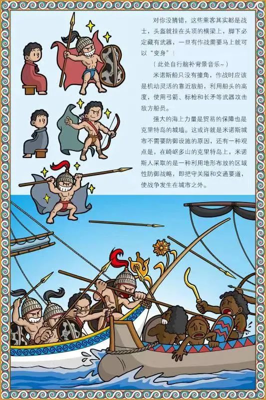 對你沒猜錯,這些乘客其實都是戰士,頭盔就掛在頭頂的橫樑上,腳下必定藏有武器,一旦有作戰需要馬上就可以“變身”!米諾斯船隻沒有撞角,作戰時應該是機動靈活的靠近敵船,利用船頭的高度,使用弓箭、標槍和長矛等武器攻擊敵方船員。強大的海上力量是貿易的保障也是克里特島的城牆。這或許就是米諾斯城市不需要防禦設施的原因,還有一種觀點是,在崎嶇多山的克里特島上,米諾斯人採取的是一種利用地形布放的區域性防禦戰略,即把守關隘和交通要道,使戰爭發生在城市之外。