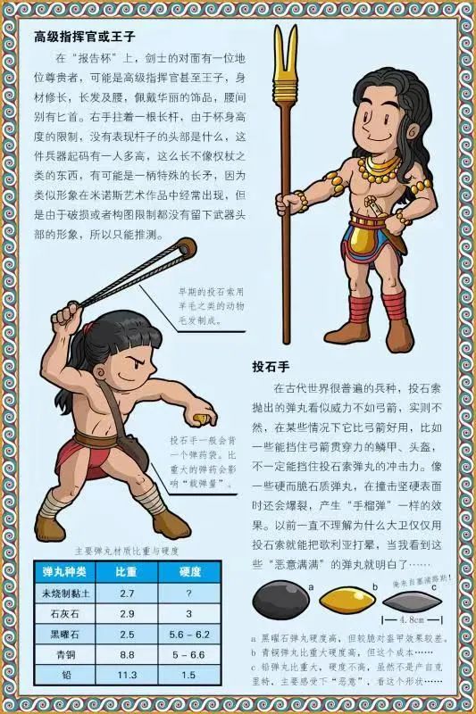 在古代世界很普遍的兵種,投石索拋出的彈丸看似威力不如弓箭,實則不然,在某些情況下它比弓箭好用,比如一些能擋住弓箭貫穿力的鱗甲、頭盔,不一定能擋住投石索彈丸的衝擊力。像一些硬而脆石質彈丸,在撞擊堅硬表面時還會爆裂,產生“手榴彈”一樣的效果。以前一直不理解為什麼大衞僅僅用投石索就能把歌利亞打暈,當我看到這些“惡意滿滿”的彈丸就明白了……早期的投石索用羊毛之類的動物毛髮製成。投石手一般會背一個彈藥袋。比重大的彈藥會影響“載彈量”。