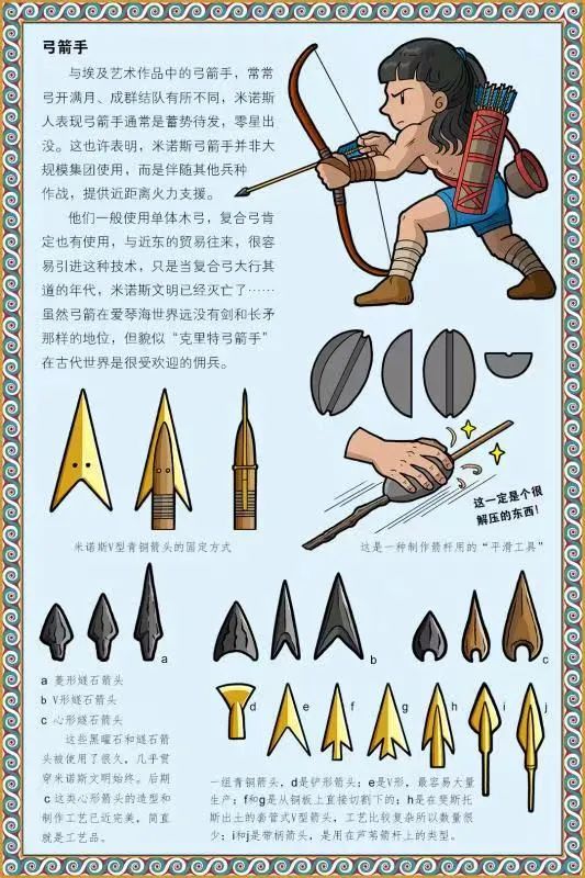 與埃及藝術作品中的弓箭手,常常弓開滿月、成羣結隊有所不同,米諾斯人表現弓箭手通常是蓄勢待發,零星出沒。這也許表明,米諾斯弓箭手並非大規模集團使用,而是伴隨其他兵種作戰,提供近距離火力支援。他們一般使用單體木弓,複合弓肯定也有使用,與近東的貿易往來,很容易引進這種技術,只是當複合弓大行其道的年代,米諾斯文明已經滅亡了……雖然弓箭在愛琴海世界遠沒有劍和長矛那樣的地位,但貌似“克里特弓箭手”在古代世界是很受歡迎的傭兵。