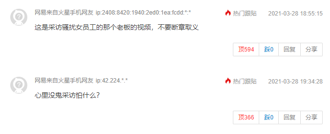 比如網上有人發文詬病《大參考》的記者野蠻、橫行不法,試圖佔領道德高地。然而評論區所有的留言,都在怒懟水軍。更是有人指出文中的配圖,出自記者質問騷擾女員工的老闆的一期節目,顯然大參考贏得了民心。