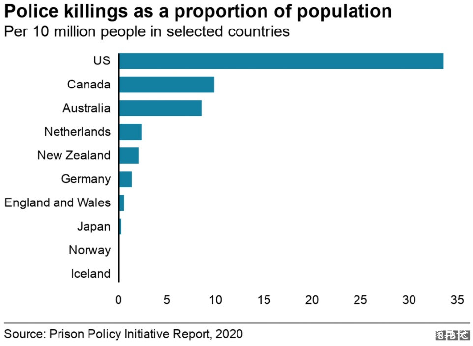 世界上大多數警察都攜帶槍支,但沒有哪個發達國家像美國官員那樣經常使用槍支來打擊本國公民,與他們所代表的人口百分比相比,對非裔美國人的開槍不成比例。