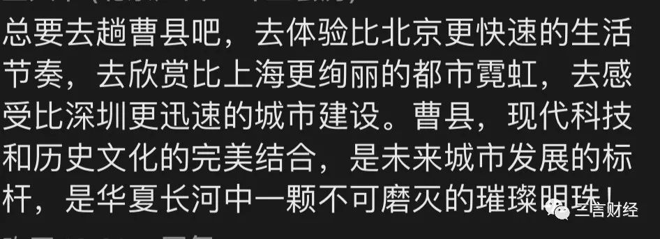 所以人總應該要去趟曹縣,去體驗一下比北京更快的生活節奏;去欣賞比上海更絢麗的都市霓虹;去感受比深圳更迅速的城市建設。曹縣,是現代科技和歷史文化的完美結合,是未來城市發展的標杆,是華夏長河中一顆不可磨滅的璀璨明珠!