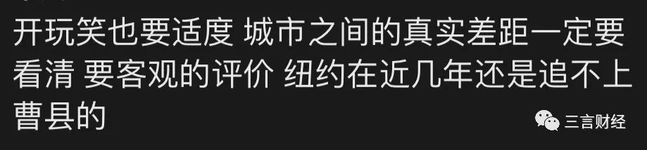 在一眾曹縣梗段子中,還有網友一本正經的強調,開玩笑要適度,城市間的真實差距一定要認清、要客觀評價,哪怕是紐約還想着超越曹縣?