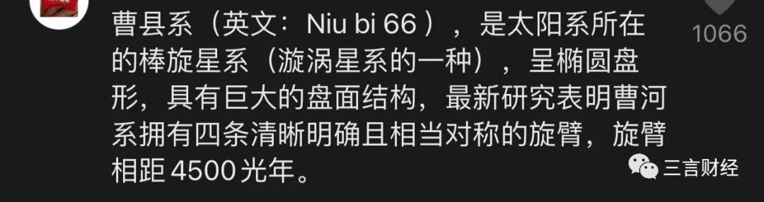 宇宙層面,曹縣系,英文名是“Niu bi 66”,是太陽系所在的棒旋星系,呈橢圓盤形,具有巨大的盤面結構,最新研究表明,曹縣系擁有四條清晰明確且相當對稱的旋臂,旋臂相聚4500光年。