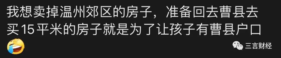 有人説自己賣了外灘房子都不知道能不能在曹縣買個15平地下室;也有人賣掉温州郊區房子,就為了孩子有個曹縣户口;還有“寧要曹縣牀,不要巴黎房”。