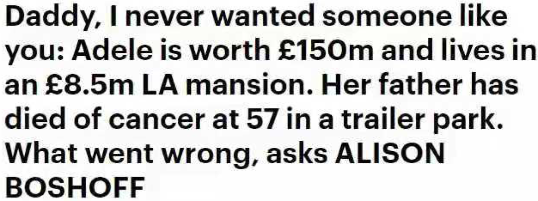 「身價1.5億英鎊的Adele住在洛杉磯價值850萬英鎊的豪宅,她57歲的爸爸卻因癌症死在拖車公園……」