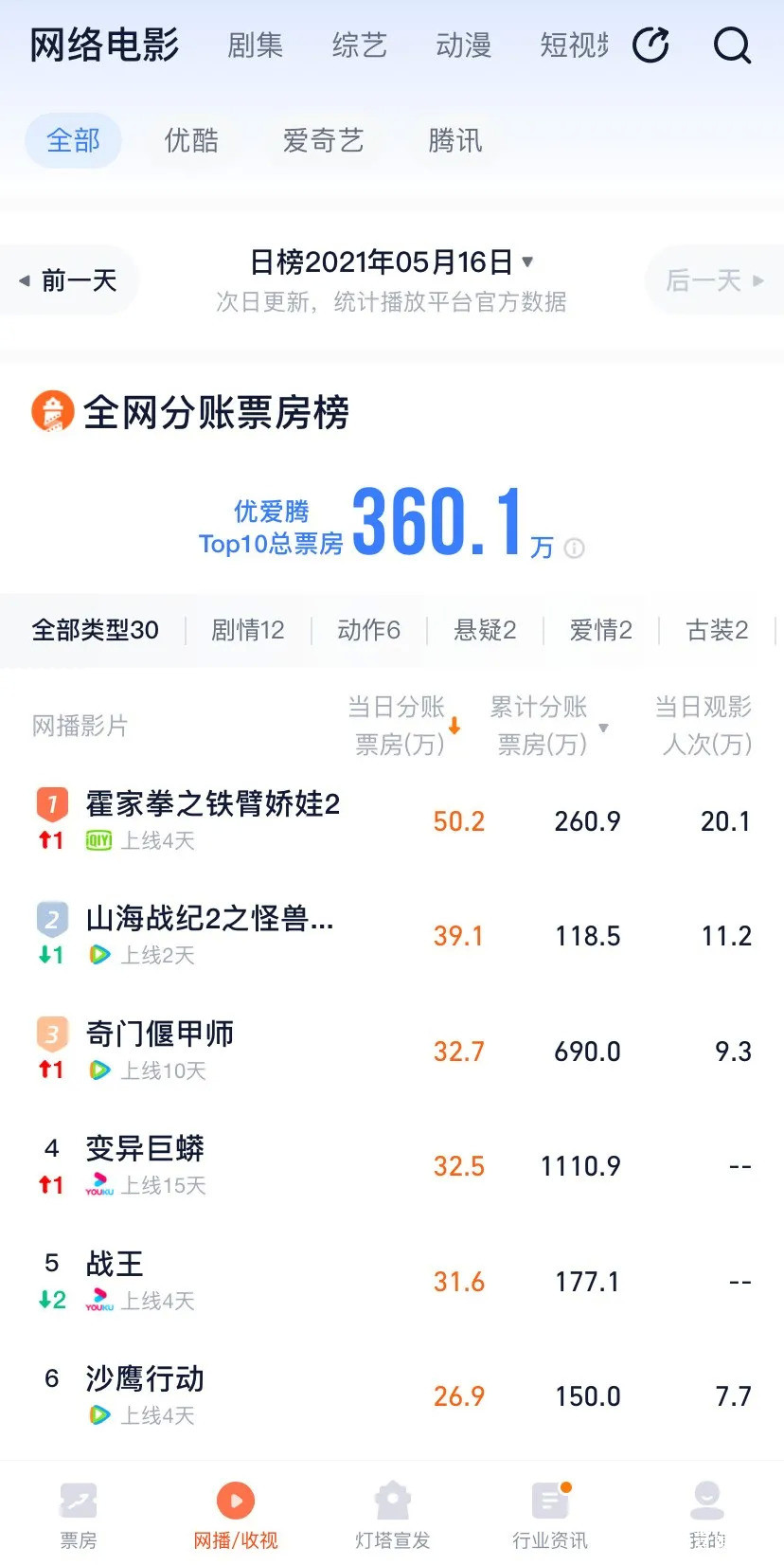 此外,該榜單還可以按照動作、劇情、喜劇、奇幻等不同題材類型,以年、月、日等不同時間單位查看同期影片的相關數據。5月16日榜單數據顯示,當日分賬票房排在前三位的分別是《霍家拳之鐵臂嬌娃2》《山海戰紀2之怪獸之王》和《奇門偃甲師》,當日優愛騰Top10總票房達到達到360萬元。