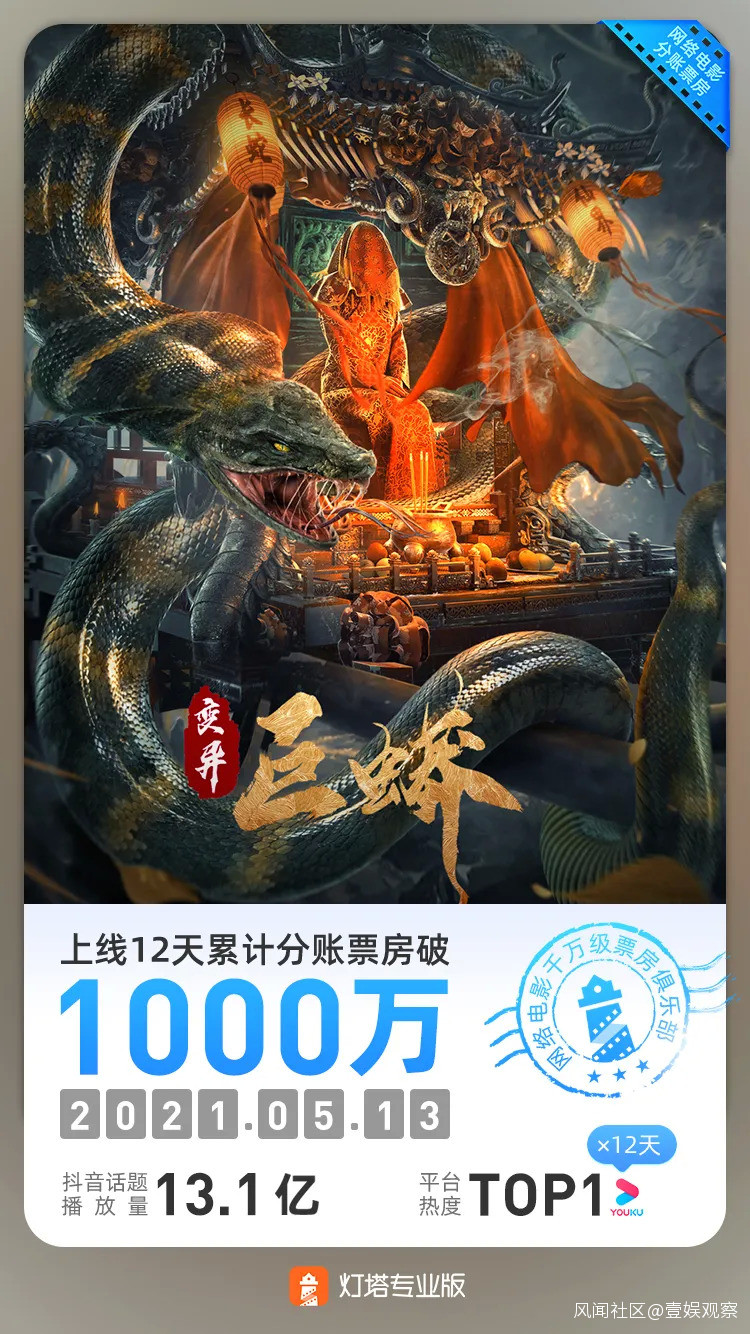 在成功打造《大蛇》《水怪》《陸行鯊》等多部“怪獸”系列網絡電影后,優酷旗下的“怪獸制燥”廠牌已經在觀眾中建立了較高的認知度,並逐步成為“怪獸”題材中的領頭羊。在今年的線上五一檔,優酷則再度打出“怪獸”牌,推出了新片《變異巨蟒》。根據燈塔專業版的全網分賬票房榜,該影片於5月2號上線後該片蟬聯優酷日榜冠軍多日,累計分賬票房12天后破1000萬,平台熱搜排名前三,表現不俗。