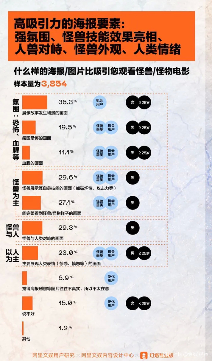 當然根據研究報告的説明,除了類型本身之外,影響用户觀影決策的依然還是影片本身的口碑。這也迴歸到創作本質層面,不論類型,最終其實還需要依靠過硬的劇本以及製作投入説話。對於宣發來説,怪獸類型片的海報要素,需要能夠涵蓋強氛圍、怪獸技能、人獸對峙和怪獸技能等方面,才能做到真的有吸引力,能夠讓用户產生觀看慾望。