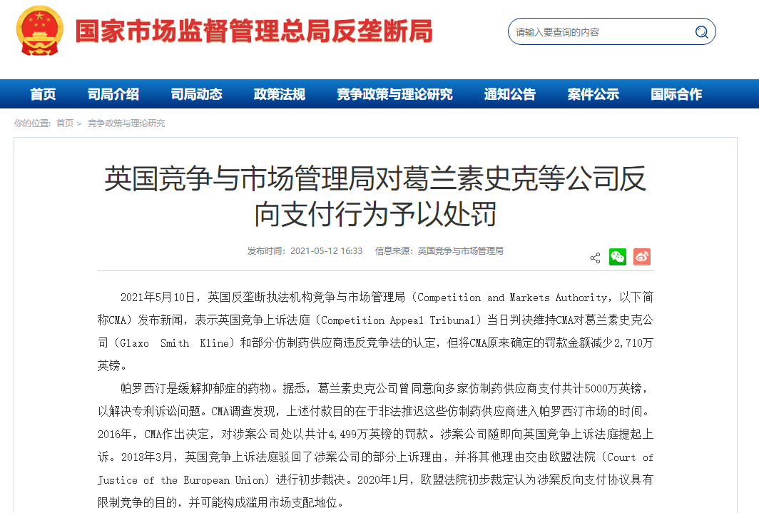 GSK體系的帕羅西汀沒進入集採,市場上仿製藥品種也較多,因此,在國內搞“延遲費”協議的情況不太可能發生。然而,此番國家反壟斷局第一時間轉發相關壟斷處罰決定,很明顯在釋放強烈信號:反壟斷調查成為常態,監管觸角很可能已經伸向了跨國藥企。