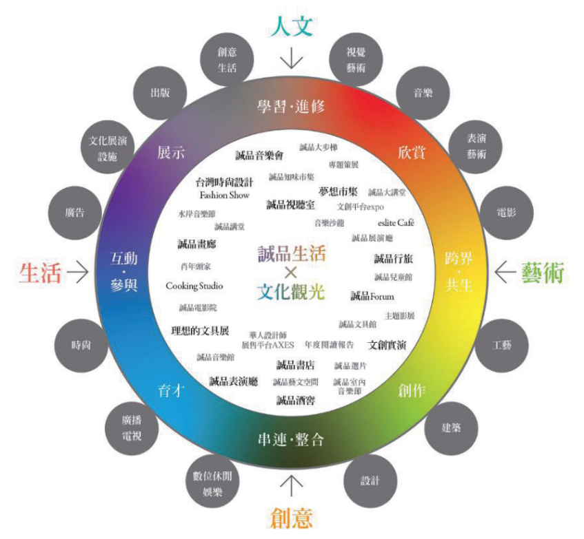 簡單概括,就是人們到了誠品生活,除了逛逛誠品書店看看書,也會順便喝咖啡、買食品、家居用品等產品,還有的旅人去誠品品牌的酒店住宿。