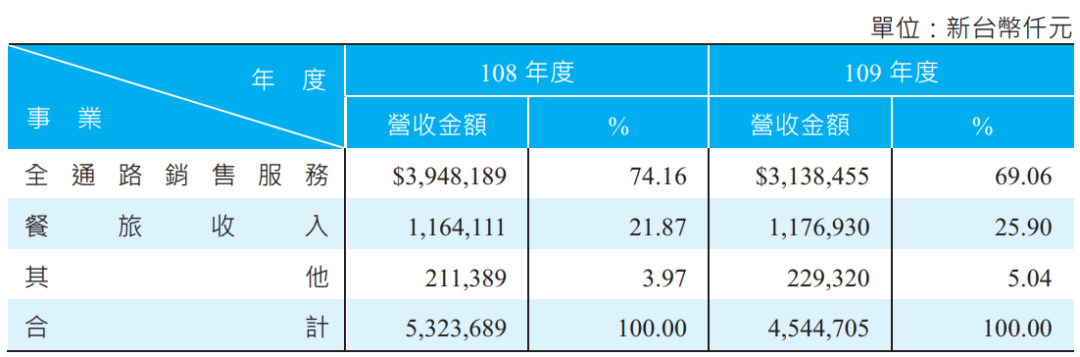 誠品將自己的業務主要劃分為全通路銷售服務(簡單理解就是以誠品書店和誠品App為核心的零售)、餐旅(主要是面向餐館和旅店的企業服務)以及其他(主要是誠品品牌的酒店)三個部分。