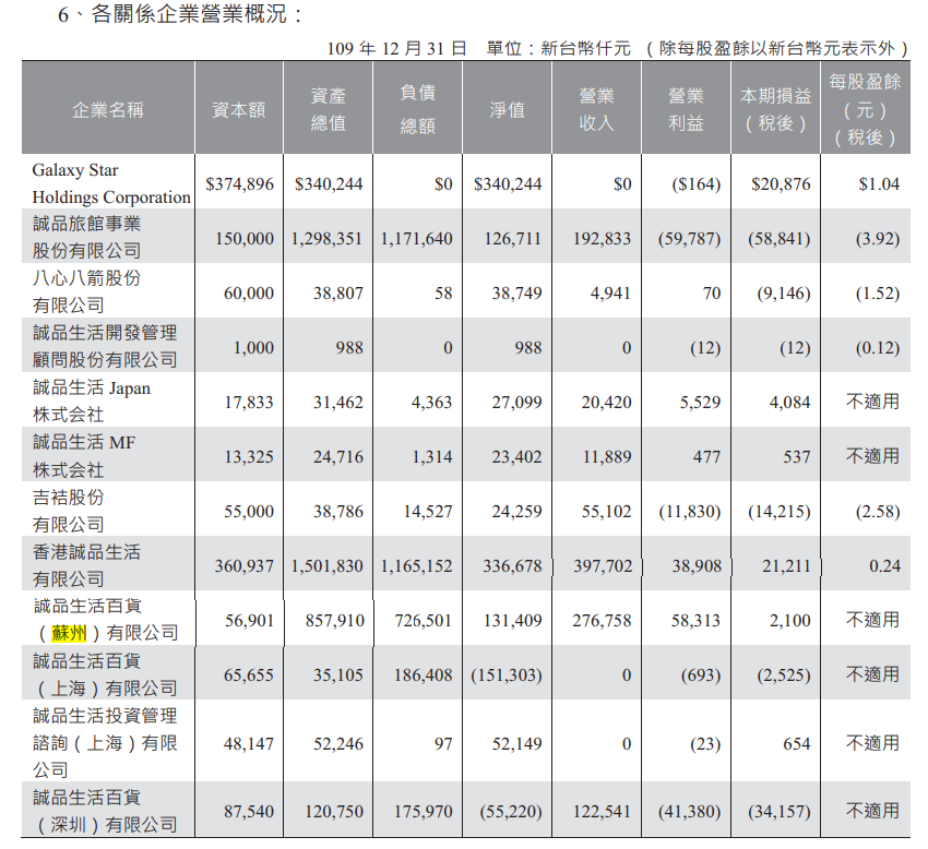誠品生活百貨(蘇州)有限公司2020年營收2.77億新台幣,營業利潤5831.3萬,税後利潤210萬