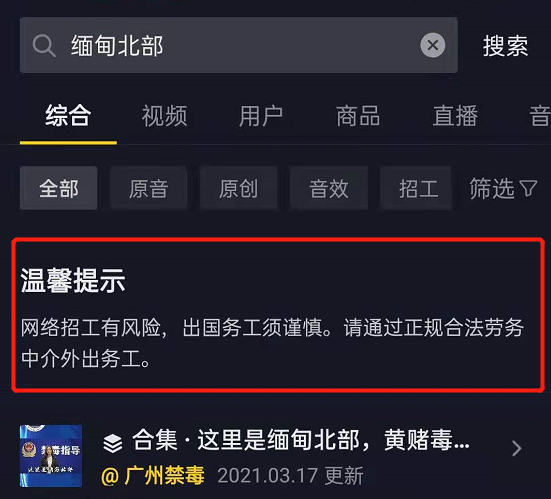 現在在一些網絡平台搜索「 緬甸北部 」,也能直接得到温馨提示,讓大家謹防網絡招工的風險。