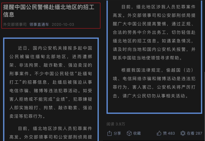很多地方公安,乃至外交部領事司都發過公告,指名道姓讓大家警惕緬北地區的招工信息。