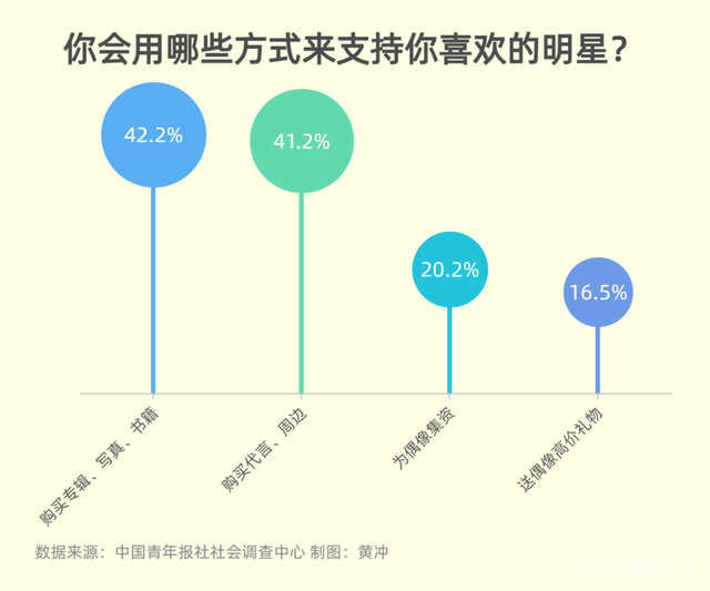 調查中,僅24.4%的受訪青少年從不在追星上花錢。具體説來,42.2%的受訪青少年會購買專輯、寫真、書籍,41.2%的受訪青少年購買代言、周邊,20.2%的受訪青少年為偶像集資,16.5%的受訪青少年送偶像高價禮物。
