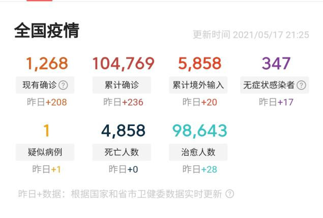截至5月17日21:25,中國累計確診新冠104769例,死亡5858例。