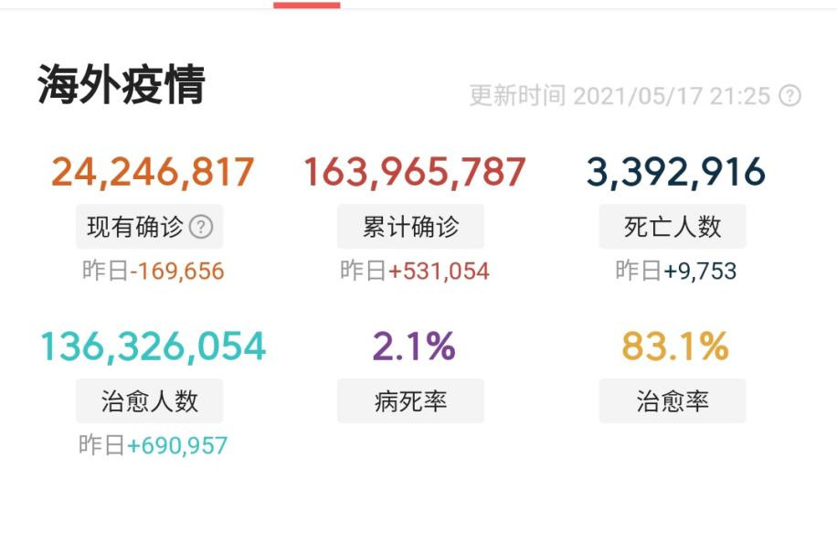 根據Worldometer實時統計數據,截至紐約時間5月16日18時30分左右,全球累計確診新冠肺炎病例163687843例,累計死亡3392534例。