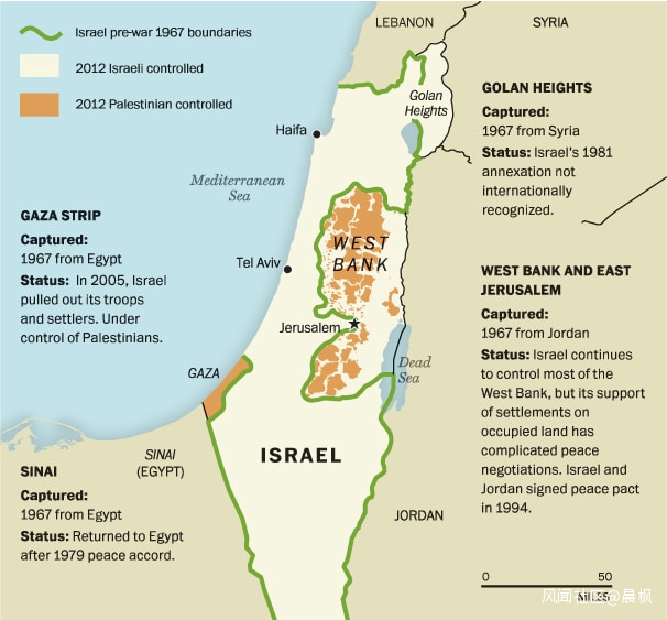 在1967年的六天戰爭中,以軍如願以償,把這些地方統統拿下,還拿下了西奈。但吃進了不等於能嚥下,西奈歸還給埃及了,加沙也歸還給巴勒斯坦了,不過約旦河西岸就不一樣了。不僅耶路撒冷完全在以色列控制之下,巴勒斯坦控制區域也被猶太人控制區分割得支離破碎,即使本來可以完全的區域也被猶太人控制的走廊人為割裂,巴勒斯坦人的日常工作、購物、看病、走親戚都要通過一道道以軍檢查哨,但猶太人穿越巴勒斯坦控制區則可以揚長而過。巴勒斯坦區也刻意被猶太人區擠向內地,與約旦隔開,確保對巴勒斯坦控制區的可靠包圍和分割。除了加沙和西奈之間的拉法口岸,巴勒斯坦沒有任何對外的口岸,巴勒斯坦人進出都必須通過以色列的口岸。