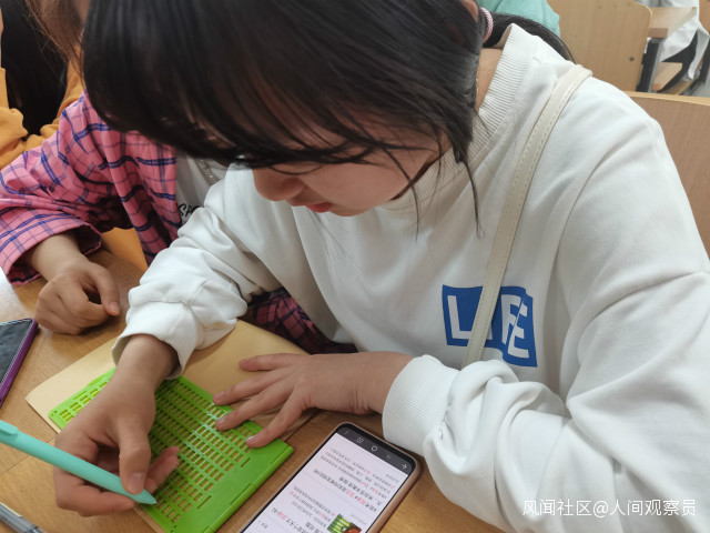 活動接入了尾聲,主持人讓同學們分享自己製作盲文書過程中遇到的問題及感悟。同學們踴躍舉手發表自己的感想,大多同學都表示製作過程非常艱難,即使觀看了製作的教學視頻,但實際操作起來也是很不容易的。通過親手製作盲文書,讓同學們懂得了盲童們的不容易,更加懂得了盲童對讀書的熱愛與渴望。最後,主持人對此次活動進行了總結:盲童眼中世界是黑暗的,他們看不到大千世界的茫茫浩渺,甚至連看到父母的模樣都是一種奢望。但是,通過閲讀,盲童能夠感受到遠方的天藍海闊,崇山峻嶺,最終從中得到成長。