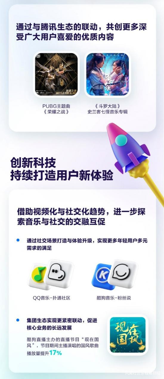 當騰訊音樂以音樂為軸心,不斷加速與騰訊生態的聯動,打破音樂的領域邊界與更多行業的業務一同形成集羣效應,探索出以內容生態為驅動的“長期價值型”增長模式時,既為自身發展儲蓄了深厚的內勁,更是為整個音樂行業的發展做長期佈局。