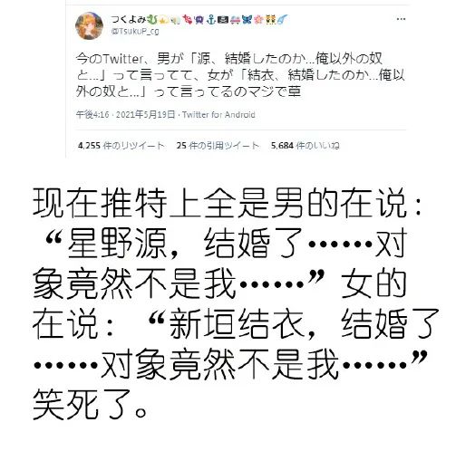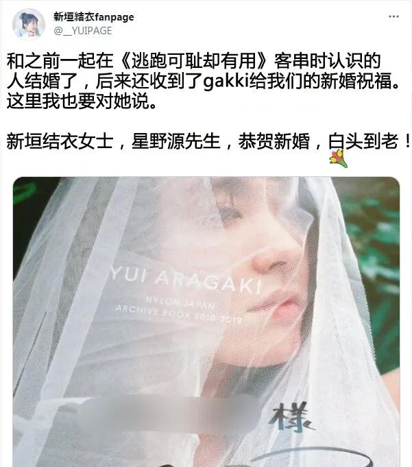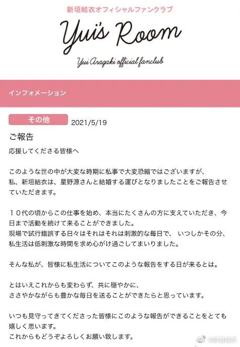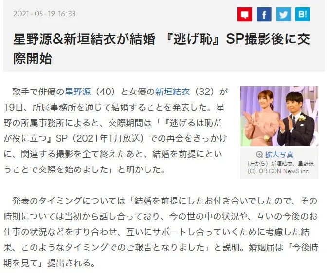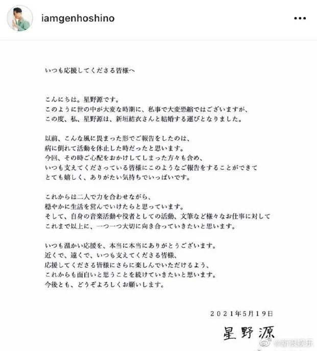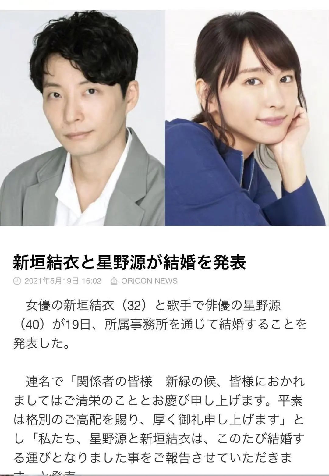 2021年5月19日,新垣結衣(32歲)與歌手、演員星野源(40歲)通過事務所公佈結婚喜訊。
