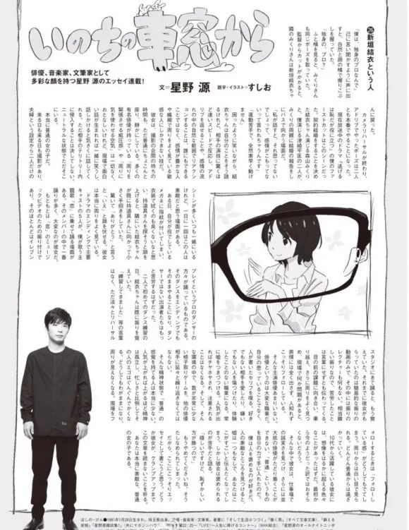 而星野源曾經在雜誌"達文西"的連載"いのちの車窓から"裏寫過一篇文章:No.26 一個叫新垣結衣的人。