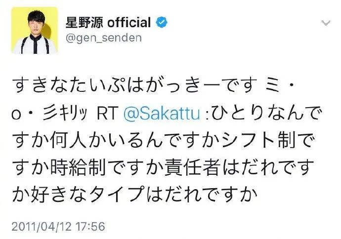 星野源十年前的回覆也被挖了出來,他曾發推回復網友:“喜歡的類型是新垣結衣。”
