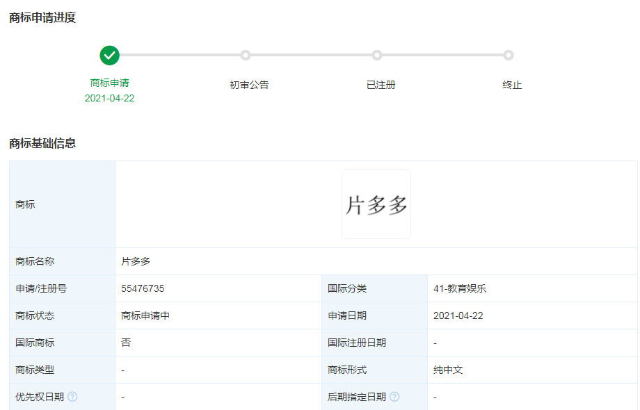 據天眼查顯示,騰訊於4月22日申請註冊了“片多多”商標,分類為“41-教育娛樂”。該商標目前還在申請中,但騰訊已於5月8日推出了“片多多”APP。