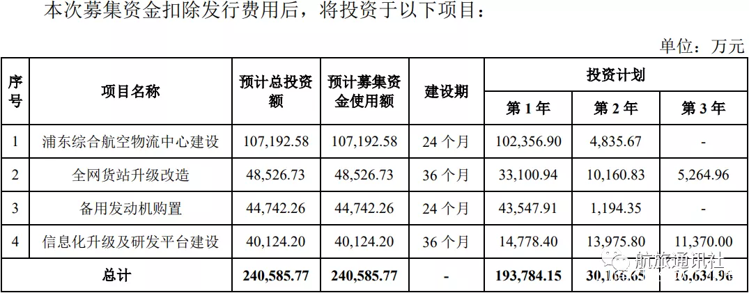本次募集資金扣除發行費用後,將用於浦東綜合航空物流中心建設、全網貨站升級改造、備用發動機購置、信息化升級及研發平台建設等。