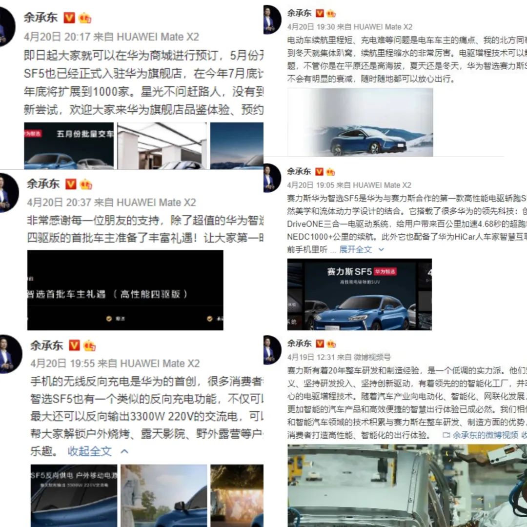 餘承東兼任華為“造車”的一把手,從他的微博動態可以一窺端倪。