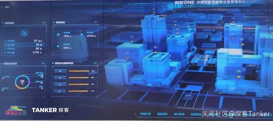 據「探客Tanker」瞭解,中關村壹號中所有智能設備都在智慧運營管理平台的統一監管下,展示中心的一塊大屏上可以對園區系統進行統一監測。園區有多少企業入駐、樓宇數量、總體面積及停車位數量等信息都可以一覽無遺。