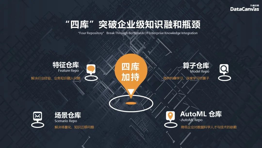 除去上述這些標準化服務之外,不少企業也有着自己的獨家秘笈。譬如九章雲極DataCanvas,為客户提供專屬的“四庫全書”,幫助企業突破知識融合瓶頸。分別為解決行業問題、融入業務知識的特徵倉庫,解決場景化、知識遷移問題的場景倉庫,提供機器學習、深度學習的算子倉庫以及降低企業對數據科學人才與技術依賴的AutoML倉庫。