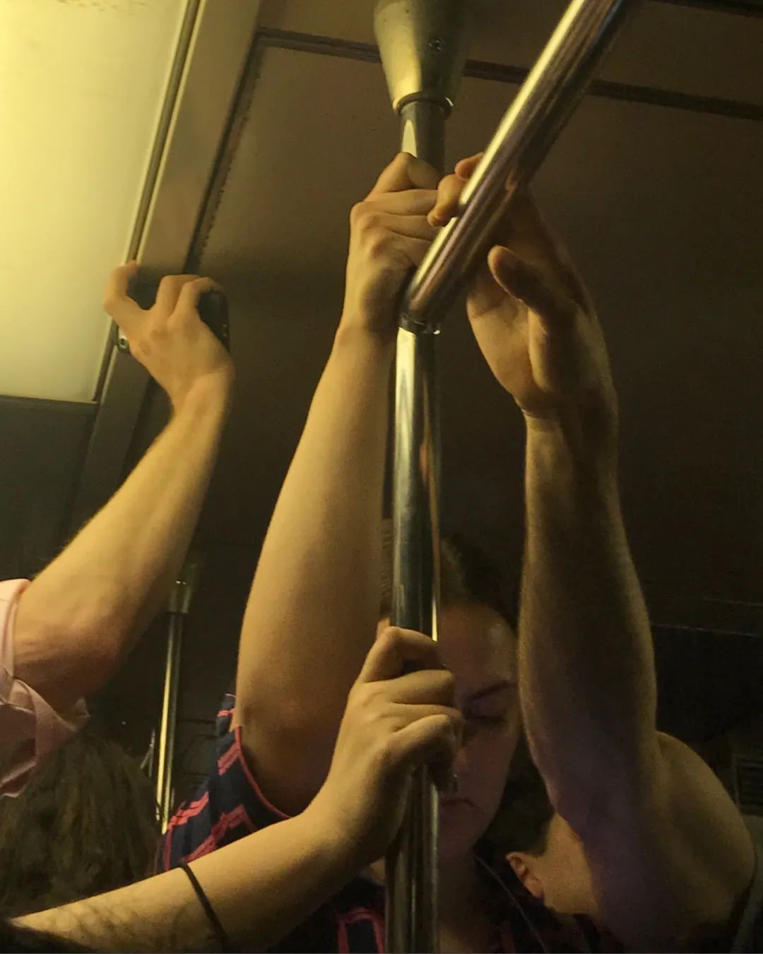 這是高峯期時的地鐵車廂,人們的手擠在一起,又要彼此保持一定的距離。