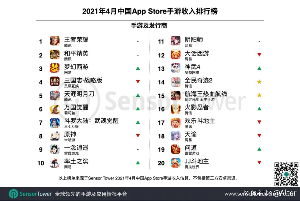 數據分析機構Sensor Tower每個月都會根據中國遊戲廠商在App Store 和Google Play 的收入進行排名。在2021年1-4月中,網易幾乎每月都有5款左右的遊戲進入TOP20。除了前面提到的《夢幻西遊》和《大話西遊》,《率土之濱》、《天諭》、《明日之後》、《倩女幽魂》、《第五人格》、《光·遇》都是熟面孔。