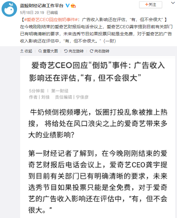 愛奇藝CEO龔宇提到目前有關部門已有明確清晰的要求,未來選秀節目如果投票只能是全免費,對於愛奇藝的廣告收入影響還在評估中,“有,但不會很大。”