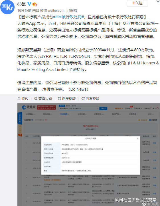 因未標明產品成份HM被行政處罰。值得注意的是,該公司已有數十條行政處罰信息,處罰事由包括以不合格產品冒充合格產品 、虛假宣傳等。