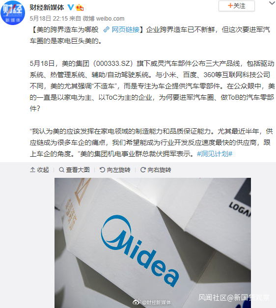 18日,美的旗下威靈汽車部件公佈三大產品線,包括驅動系統、熱管理系統、輔助/自動駕駛系統。與小米、百度、360等互聯網科技公司不同,美的尤其強調“不造車”,而是專注為車企提供汽車零部件。