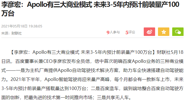 李彥宏發佈全員信,首次明確百度Apollo業務的三種商業模式——一是為主機廠商提供Apollo自動駕駛技術解決方案,助力車企快速搭建自動駕駛能力。2021年下半年,Apollo智能駕駛將迎來量產高峯,每個月都會有一款新車上市,未來3-5年內預計前裝量產搭載量達到100萬台;二是百度造車,端到端地整合百度自動駕駛方面的創新,把最先進的技術第一時間推向市場;三是共享無人車。
