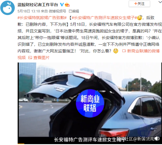 昨日,@長安福特發佈視頻,同時文案寫到,“日本動漫中男生高速奔跑掀起女生的裙子,是真的嗎?”並在其後附上“帶你一飽眼福”等話題詞。該則微博和視頻引起眾多網友的不滿與質疑。隨後長安福特刪除內容併發布致歉聲明。