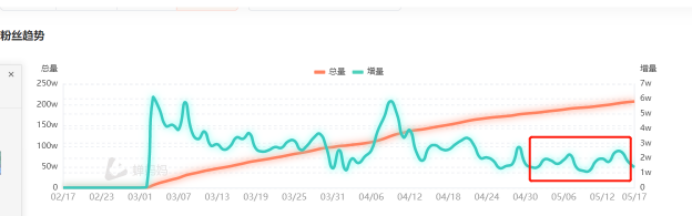 又不得不提一句,在小紅書,與尹正走過相似路線的張韶涵也因為曾在《歌手》節目翻紅之後,網友們追着要她的食譜。可翻看她近三十天筆記記錄,竟已經沒有一條品牌推廣了。而回到尹正,查看他的粉絲增長情情況,在3月3號和4月9號有兩個數據增長的大爆發,進入5月份,粉絲增量已經只徘徊在2~3W。“頂流”的下坡路,來的着實有點快。
