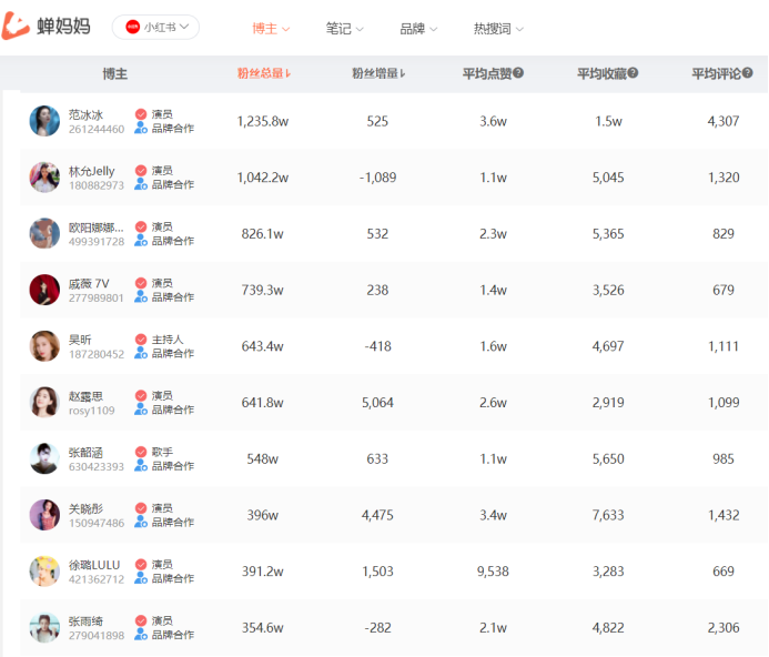 在粉絲量級上,截止今年5月,根據禪媽媽數據統計,粉絲前十的明星已經超過300多萬粉,范冰冰和林允更是直達千萬。後者小紅書粉絲數更是與微博粉絲數相當,這樣的吸粉程度,成績相當不錯。