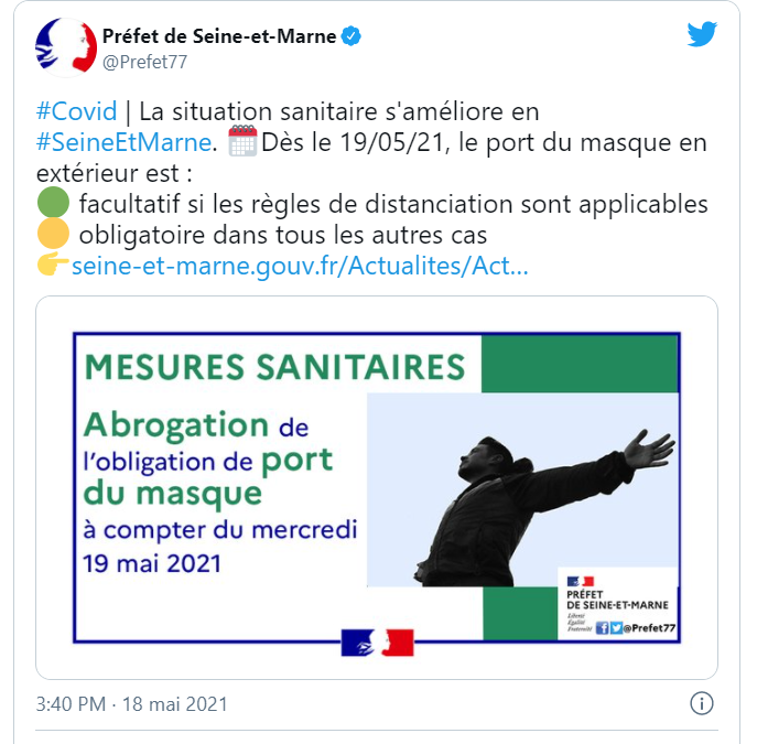 自5月19日星期三起,如果遵守社交距離規則,在Seine-et-Marne省,在户外戴口罩不再是必須的。