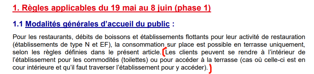 為此,政府發佈的關於重開露台相關規定的文件中回應了這件事情。答案是:放心,廁所可以使用。就算廁所在餐廳內部,也是可以使用的。