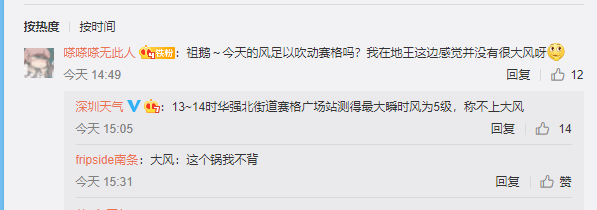 有網友在深圳市氣象局官方微博@深圳天氣 微博評論區留言提問:“今天的風足以吹動賽格嗎?”