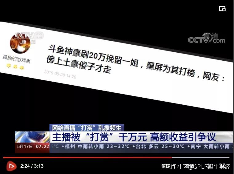 而在5月17日CCTV-13《朝聞天下》節目中,在題為“主播被‘打賞’千萬元,高額收益引爭議”的報道里,關於鬥魚“神豪”天價打賞主播的自媒體報道在節目中被提及。